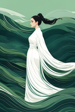 miluo_zcch, digital art, vector art, female, woman, Asian, long black hair, white dress, flowing dress, green background, abstract background, wind, elegant, side profile, serene expression, smooth textures, stylized, minimalistic, green and white color palette, traditional Asian attire, serene, calm, peaceful, long hair, windblown hair, soft colors, smooth lines, delicate, graceful, medium shot, upper body, standing, looking ahead, outdoors, nature, tranquil, quiet, peaceful scene<lora:米洛丨宋代青绿1.5-v1:0.8>,