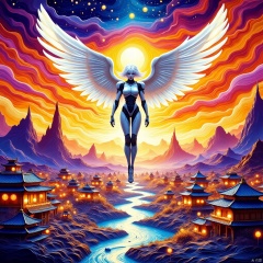 Masterpiece, best quality, epic scenes, impactful visuals, (sunset:1.2),beautiful angels falling from the sky,white hair and blue eyes, robot cyborg full body, swoops down from the sky, lace patterns,white machinery wings, stretched shapes, holy light surround, depth of field, sense of space, vivid colors, surreal themes, ethereal feelings, pressure, dramatic composition, cinematic light and shadow, Diving down over the village dotted with chinese new year elements ,crowd,fractal art, HDR, UHD, lineart style, TIANQIJI,