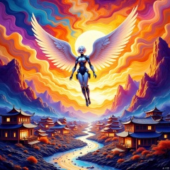 Masterpiece, best quality, epic scenes, impactful visuals, (sunset:1.2),beautiful angels falling from the sky,white hair and blue eyes, robot cyborg full body, swoops down from the sky, lace patterns,white machinery wings, stretched shapes, holy light surround, depth of field, sense of space, vivid colors, surreal themes, ethereal feelings, pressure, dramatic composition, cinematic light and shadow, Diving down over the village dotted with chinese new year elements ,crowd,fractal art, HDR, UHD, lineart style, TIANQIJI,Fluid art