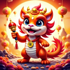 The character is holding a string of red firecrackers,a vibrant and animated character that appears to be a fusion of a dragon and a lion. The character is predominantly red with white accents, and it has a cheerful expression with wide eyes and a broad smile. It holds a golden bell in one hand and a golden rattle in the other. The character is adorned with a golden necklace that has a pendant with Chinese characters. The background is a warm orange hue, with floating lanterns and a silhouette of a mountain rangee