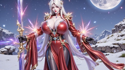 YMJH玄焰炽九宸,1girl,solo,upper body,huge breasts,cleavage,long hair,blonde hair,hair ornament,crown,dress,red dress,pantyhose,long sleeves,black belt,armor,wide sleeves,gloves,black gloves,flower,choker,jewelry,red lips,magic,sparkle,red lips,sword,holding sword,snow,snowing,snow mountains,HugeYM,luxueqi,Hugebr,best quality,realistic,huolinger