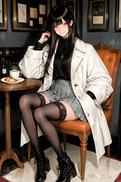 1girl, solo, long hair, looking at viewer, smile, bangs, skirt, black hair, thighhighs, long sleeves, brown eyes, jewelry, sitting, closed mouth, full body, pleated skirt, earrings, boots, food, black thighhighs, indoors, necklace, black footwear, high heels, sweater, cup, coat, turtleneck, chair, table, plate, grey skirt, high heel boots, hand in pocket, white coat, ankle boots, lace-trimmed legwear