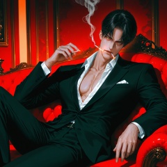 solo, looking at viewer, short hair, bangs, shirt, black hair, long sleeves, 1boy, holding, sitting, jacket, male focus, collared shirt, pants, indoors, black jacket, head tilt, parted bangs, feet out of frame, chair, black pants, formal, suit, pectorals, couch, smoke, cigarette, smoking, unbuttoned, partially unbuttoned, pectoral cleavage, unbuttoned shirt, black suit, holding cigarette, armchair,,cinematic lighting,light particles,lens flare, [artist: wlop],artist:chen_bin,[[artist:ke-ta]], artist: hitenkei,,good work, (best quality), illustration, depth of field, (color),masterpiece,best quality,(artist:mignon:0.8)