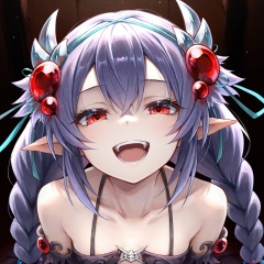 masterpiece, best quality, high quality, Traptrix Atrax \(ygo\), 1girl, solo, long hair, looking at viewer, smile, open mouth, hair ornament, red eyes, purple hair, pointy ears, twin braids,