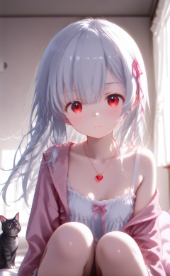 masterpiece,best quality,high quality,loli,chromatic_aberration,//,1girl,ribbon,cat,pink ribbon,long hair,sitting,hair ribbon,pillow,looking at viewer,red eyes,heart-shaped pillow,window,solo,white hair,pink jacket,jewelry,animal,off shoulder,jacket,indoors,dress,heart,necklace,curtains,knees up,white camisole,grey hair,white dress,sleeveless,pink cardigan,long sleeves,closed mouth,collarbone,bare shoulders,frills,blush,blurry,blurry background,camisole,//,year_2023,year_2024,//,official art,depth of field,detailed light,blurry background,cinematic lighting,ray tracing,ultra detailed,god rays,backlighting,photo background,film grain,chromatic aberration,volumetric lighting,depth of field,blurry background,shiny skin,floating hair,cinematic lighting,day,very aesthetic,<lora:rouhe——【noob】hans:1>,