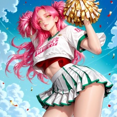 The image depicts an animated character with long, flowing pink hair and green eyes. She is wearing a red cropped top with the word "BAND" written on it in white letters, paired with a white pleated skirt that has teal trim. The character is holding yellow pom-poms in both hands and appears to be cheering or celebrating. The background shows a clear blue sky with some clouds and a few scattered colorful confetti-like pieces. The overall scene suggests a lively and energetic atmosphere,kidmo,As109,magion02,deadflow,bm tol,ask \(askzy\),mamimi \(mamamimi\)