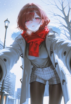 masterpiece,best quality,artist:john_kafka,artist:nixeu,artist:quasarcake,chromatic aberration,film grain,high contrast,color contrast,cold colors,gritty,graphite \\\\(medium\\\\),higuchi madoka,1girl,bare tree,black pantyhose,blurry,blush,breasts,breathing,brown hair,building,coat,depth of field,dot nose,from below,fur-trimmed coat,fur trim,grey coat,grey shirt,grey shorts,lamppost,leaning forward,long sleeves,looking at viewer,medium breasts,mole,mole under eye,nail polish,open clothes,open coat,outdoors,pantyhose,parted lips,plaid clothes,plaid shorts,reaching,reaching towards viewer,red eyes,red nails,red scarf,scarf,shirt,short hair,shorts,snowing,solo,