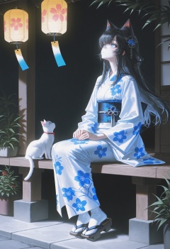masterpiece,best quality,artist:john_kafka,artist:nixeu,artist:quasarcake,chromatic aberration,film grain,high contrast,color contrast,cold colors,gritty,graphite \\\\(medium\\\\),cat, 1girl, kimono, japanese clothes, black hair, animal ears, sitting, white cat, sandals, floral print, long hair, cat ears, black cat, plant, zouri, tabi, solo, white kimono, looking up, hair ornament, print kimono, blue eyes, wide sleeves, outdoors, socks, yukata, white socks, sash, obi, geta, wind chime, closed mouth, full body, long sleeves, lantern,