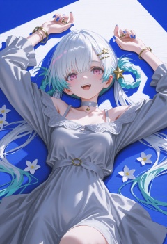 masterpiece,best quality,wanke, impressionism, stu dts, infukun, reoen, shion \(mirudakemann\), wlop, (isshiki \(ffmania7\):0.9),1girl, solo, long hair, looking at viewer, bangs, hair ornament, jewelry, purple eyes, braid, twintails,multicolored hair, choker, hairclip, pink eyes, off shoulder, star \(symbol\), nail polish, bracelet, aqua hair, ring, hair rings, star hair ornament,long hair, breasts, blush, smile, open mouth, breasts, open mouth, long sleeves, dress, very long hair, flower, white hair, lying, on back, white dress, arms up, white flower, grey dress ,backlighting,blue and white theme,