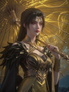 An Asian woman of medium size, wearing a gold necklace with pearls and crowns, with an ornament on her forehead. The woman's hair is long wavy hair, her eyes are bright pink, gold-pink eyeshadow, and her lips are darker pink, adding a touch of beauty to the picture, wearing black gold clothing, wearing a gold necklace and a gold piece bracelet. She held a golden parasol in her right hand, and smiled with her left hand in front of her face. She stood in front of a huge golden umbrella with her left hand on the handle of the umbrella. The umbrella is very textured and has golden patterns, which is in sharp contrast to the women's clothing. The background is the forest at night