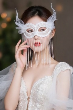 lace eye mask,The image depicts a person wearing an elegant white dress adorned with intricate beading and sequins. The dress features sheer,flowing sleeves and a plunging neckline. The person is also wearing a decorative white mask that covers the eyes and extends into delicate,wing-like structures on either side of the head. The mask is embellished with cascading strands of beads or pearls,adding a touch of sophistication and mystery to the overall look. The background is blurred,with hints of greenery and soft bokeh lights,suggesting an outdoor or garden setting. The person's hand is gently touching the mask,enhancing the graceful and poised appearance