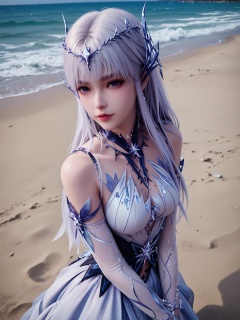 realistic style photo outstanding style,tall,cute,in her teens. Use soft lighting to cast gentle shadows on the subject,adding a touch of dimension to your images without compromising details,score_9,score_8_up,score_7_up,Seaside,beach,waves,full body,<lora:圣采儿-神降套装v5:0.65>,long silver hair adorned with intricate,crystal-like designs. Her attire is intricately designed,with a form-fitting white bodysuit,dress,