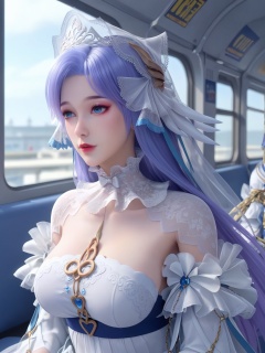 solo,1girl,<lora:王者荣耀-大乔520Pony:0.65>,blue eyes,pink eyeliner,long,flowing lavender hair,wears a white,ornate gown with intricate lace and embroidery,high collar and voluminous sleeves adorned with delicate lace and pearls,BREAK fair_skin,white_skin,shiny_skin,Ivory_skin,solo focus,(perfect_face:1.2),(perfect_anatomy:1.1),(upper_body:1.2),(portrait:1.1),large breasts,sitting,(train_interior:1.1),(blurry_background:1.2),score_9,