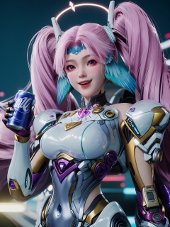 score_9_up,1girl,solo,can, holding_can, holding,looking_at_viewer, smile, open_mouth, blush.<lora:吞噬星空-艾辰Pony:0.7>,striking,voluminous,pastel pink hair styled in twin high ponytails,with a halo-like object floating above her head.wears a form-fitting,high-tech outfit that combines white,purple,and gold hues,with sleek,futuristic designs and glowing blue accents. Her outfit includes a high collar and long sleeves,a robotic hands.,
