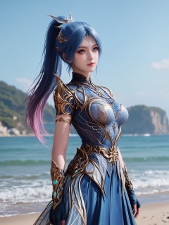 realistic style photo outstanding style,tall,cute,in her teens. Use soft lighting to cast gentle shadows on the subject,adding a touch of dimension to your images without compromising details,score_9,score_8_up,score_7_up,Seaside,beach,waves,upper body,<lora:斗罗大陆2-冬儿的战衣Pony:0.7>,blue hair,tied back with a large,pink hairpiece,blue eyes,wearing an ornate,fantasy-style armor that is predominantly blue and silver.blue dress,