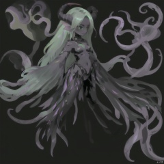 1girl, long hair, simple background, white background, green eyes, full body, green hair, see-through, multiple views, colored skin, monster girl, tentacle hair, reference sheet, black skin