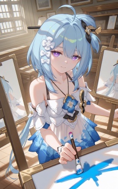 8k,best quality,masterpiece,(ultra-detailed),(high detailed skin),((artist:reoen),(artist:fuzichoco),(artist:atdan),(artist:torino_aqua),year 2024:0.8),[artist:wlop],[artist:ningen_mame],artist:ciloranko,[[artist:rhasta]],artist:tidsean,colorful,<lora:xl-ill-Griseo(Honkai Impact 3)-v1-000010:0.8>,(paintbrush:1.7),easel,canvas \(object\),still life,griseo:xiamengruhui\(honkai impact 3\),1girl,solo,long hair,hair ornament,ahoge,blue hair,hair between eyes,purple eyes,smile,