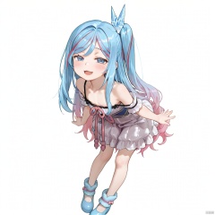 masterpiece, best quality, high quality, Witchcrafter Madame Verre \(ygo\), 1girl, solo, long hair, looking at viewer, blush, smile, open mouth, blue eyes, dress, bare shoulders, blue hair, pink hair, gradient hair, blue footwear, standing, loli, white background,simple background,