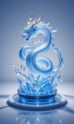 blue eyes, horns, grey background, water, no humans, reflection, ice, blue theme, dragon, eastern dragon, reflective floor,ic_figurine