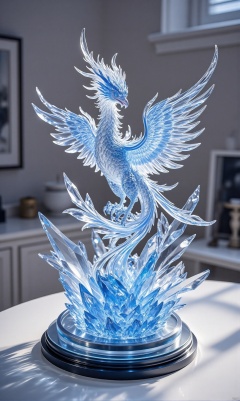 blue eyes, wings, artist name, indoors, no humans,  ice, crystal, phoenix,,ic_figurine,mythical animals