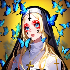 qzsx, 1girl, solo, nun, blue eyes, bug, butterfly, cross, necklace, jewelry, parted lips, long hair, blue butterfly, habit, looking at viewer, portrait, blonde hair, lips, yellow background, facial mark, cross necklace