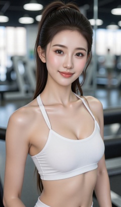 A beautiful girl with long hair, ponytail, big breasts, face facing the viewer, upper body photography, high ponytail,pure white sports vest, shoulderless sports camisole, wet fair skin, water on the body, sweat drops, Shiny skin, sweat on skin, gym background, standing on treadmill, wet body, bright indoor light, realistic light and shadow, professional composition