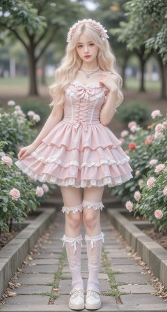 lolita,1girl,solo,half body,Necklace, outdoor, flowers,pink lolita,white hair,standing ,long legs,White short socks, white Mary Jane shoes,Miniskirts,long legs,long legs,Bare leg,Bare thighs, ultra-short Lolita,Bare leg