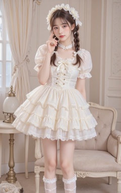 1girl, solo, long hair, bangs, brown hair, black hair, hair ornament, dress, bow, ribbon, brown eyes, standing, braid, flower, short sleeves, hair bow, frills, choker, socks, puffy sleeves, indoors, hand up, hair flower, white dress, twin braids, puffy short sleeves, pillow, book, kneehighs, window, feet out of frame, curtains, white socks, realistic, lamp, white choker