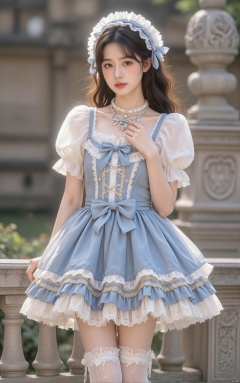1girl, solo, long hair, black hair, thighhighs, blue dress, jewelry, short sleeves, frills, puffy sleeves, necklace, blurry, lolita fashion, realistic,lolita