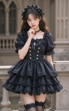 1girl, solo, long hair, black hair, half body,thighhighs, black dress, jewelry, short sleeves, frills, puffy sleeves, necklace, blurry, lolita fashion, realistic,lolita