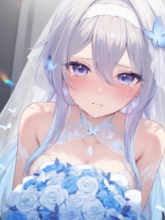 yishijie \(qingxu\),1girl, solo, long hair, breasts, looking at viewer, blush, bangs, hair ornament, dress, holding, cleavage, hair between eyes, bare shoulders, jewelry, medium breasts, blue hair, purple eyes, flower, grey hair, multicolored hair, hairband, tears, white dress, gradient hair, rose, halterneck, ring, crying, bug, butterfly, veil, blue flower, crying with eyes open, white hairband, bouquet, wedding dress, bridal veil, blue rose, holding bouquet, blue butterfly