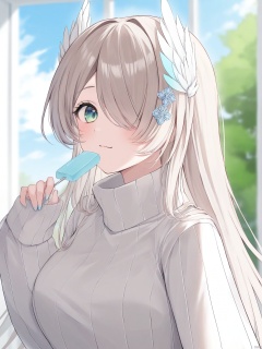 yishijie \(qingxu\),1girl, solo, long hair, breasts, looking at viewer, blush, smile, bangs, large breasts, hair ornament, long sleeves, holding, closed mouth, green eyes, blue hair, upper body, white hair, sky, day, cloud, virtual youtuber, nail polish, hair over one eye, blurry, sweater, sleeves past wrists, :3, blurry background, turtleneck, head wings, blue nails, one eye covered, turtleneck sweater, white sweater,