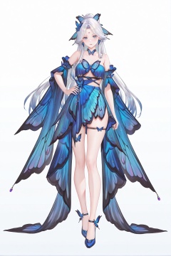 8k,best quality,masterpiece,(ultra-detailed),(high detailed skin),((artist:reoen),(artist:fuzichoco),(artist:atdan),(artist:torino_aqua),year 2024:0.8)1girl,[artist:wlop],[artist:ningen_mame],artist:ciloranko,[[artist:rhasta]],artist:tidsean,colorful,full body,full shot,standing,looking at viewer,(solo:1.2),simple background,(white background:1.2),hand on own hip,(white background:1.1),<lora:13yaoza0:0.8>,13yaoza0,1girl,bare shoulders,blue butterfly,blue dress,blue eyes,breasts,butterfly hair ornament,collarbone,earrings,forehead mark,hair ornament,jewelry,long hair,white hair,A full-body portrait of a young girl,standing gracefully,pastel art style,high-key lighting,shoujo manga influence,hd quality,delicate details,