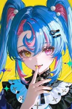 8k,best quality,masterpiece,(ultra-detailed),(high detailed skin),artist:john kafka,(artist:wanke:0.9),artist:fuzichoco,artist:quasarcake,(artist:nixeu:0.8),(1girl:1.2),upper body,light grin,chromatic aberration,cyberpunk,licking finger,glitch lump on face,lens_flare,colorful,chromatic aberration,dynamic pov,Chromatic Aberration,Glitch lettering,abstract art,(clear lines:1.1),(squares:1.1),bright,limited palette,canonical composition,(neat diagonal striped background:1.2),(Light Yellow background:1.1),ultra-detailed,film grain,geometry stripe,genderswap,<lora:lkk-noob-Tanger-000014:0.8>,Roccia \(Wuthering Waves\),clothes: Roccia def dress,Roccia hair ornament,1girl,solo,blue hair,twintails,multicolored hair,heterochromia,