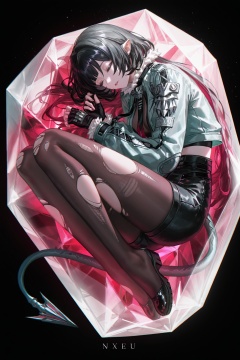 artist:nixeu,artist:john kafka,artist:wanke,artist:fuzichoco,artist:quasarcake,lonesomnia,original,highres,<lora:jijia-gnoobv-Tanger-000010:0.25>,jijia,2d,anime,1girl,1girl,black_background,closed_eyes,fetal_position,frutiger_aero,shadow,solo,transparent trapped,full_body,(trapped in crystal:1.2),large crystal,<lora:jiandoe-noob-Tanger:0.8>,jiandoe,tail,pointy ears,default clothes,green jacket,1girl,black hair,torn clothes,gloves,fingerless gloves,shorts,torn pantyhose,suspenders,necktie,sling,