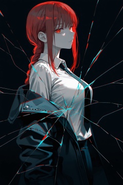 by [lack|fuzichoco|lam|kinta \(distortion\)|wlop|quasarcake|nixeu|happoubi jin],dark,black theme,spot color,red eyes,looking at viewer,makima \(chainsaw man\),jacket,necktie,black background,from side,high contrast,indoors,impasto,cracked glass,reflection,chromatic aberration,glitch,masterpiece,best quality,very aesthetic,absurdres,<lora:illustrious_noobai_epsilon_pred_1_masterpieces_v1:1>,<lora:illustrious_noobai_epsilon_pred_1_best_quality_v1:1>,