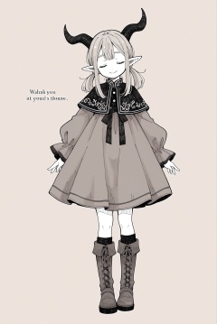 masterpiece,best quality,<lora:jijia-gnoobv-Tanger-000014:0.4>,jijia,2d,anime,artist:hey,solo,horns,1girl,monochrome,pointy ears,closed eyes,dress,simple background,standing,long hair,smile,short hair,boots,twintails,full body,english text,