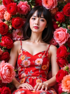 miluo_htjc,flowers,chick with fair skin and a shoulder-length bob rocking a red floral dress, chilling among vibrant roses and peonies. <lora:miluo丨极致人像丨花团锦簇-1.3:1>