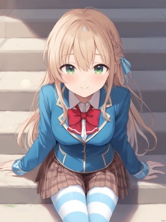yishijie \(qingxu\),1girl, solo, long hair, breasts, looking at viewer, blush, smile, bangs, skirt, blonde hair, long sleeves, bow, ribbon, sitting, closed mouth, school uniform, green eyes, jacket, hair ribbon, braid, pantyhose, pleated skirt, outdoors, striped, bowtie, red bow, plaid, plaid skirt, red bowtie, french braid, brown skirt, stairs, striped pantyhose