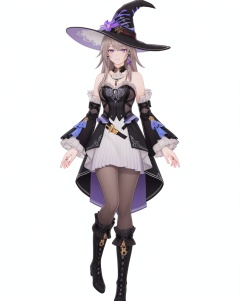 8k,best quality,masterpiece,(ultra-detailed),(high detailed skin),(by nanoless, by misumi \(macaroni\),:0.5),A full-body portrait of a young girl,standing gracefully,pastel art style,high-key lighting,shoujo manga influence,hd quality,delicate details,full body,full shot,standing,looking at viewer,(solo:1.2),simple background,white background,<lora:herta-sd-Tanger-000019:0.8>,The herta \(honkai: star rail\),daherta,clothes:daheta purple witch dress,witch hat,teengirl,1girl ,long hair,boots,detached sleeves,purple eyes, grey pantyhose,black footwear, earrings,jewelry,