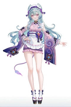8k,best quality,masterpiece,(ultra-detailed),(high detailed skin),((artist:reoen),(artist:fuzichoco),(artist:atdan),(artist:torino_aqua),year 2024:0.8)1girl,[artist:wlop],[artist:ningen_mame],artist:ciloranko,[[artist:rhasta]],artist:tidsean,colorful,full body,full shot,standing,looking at viewer,(solo:1.2),simple background,(white background:1.2),hand on own hip,(white background:1.1),<lora:mjyue-IL-Tanger:0.8>,Yumemizuki Mizuki /(Genshin Impact/),clothes: purple kimono with white apron and maid headdress,tail,1girl,japanese clothes,wa maid,purple flower,purple eyes,detached sleeves,apron,maid headdress,long hair,A full-body portrait of a young girl,standing gracefully,pastel art style,high-key lighting,shoujo manga influence,hd quality,delicate details,