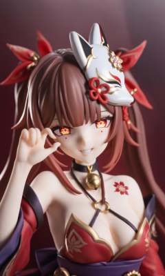 figure,sparkle \(honkai: star rail\),1girl,amazing cinematic,sparklehsr,evil,menacing,glowing eyes,yandere,holding face,red gold-trimmed kimono,o-ring halterneck,hair ornaments,well-drawn hands,fingers,bare hand,thumbs,mole under both eyes,red string,flower tattoo,neck bell,red fox mask on head,butterfly-shaped pupils,brown gradient hair,ominous red lighting,scary,grinning,spider lily flowers,masterpiece,high quality,<lora:sparkle_v3:0.8>,