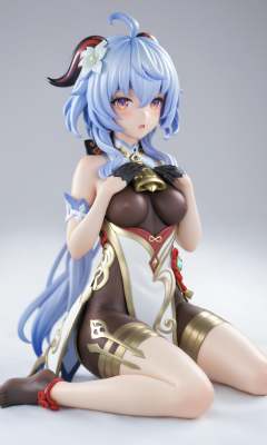figure,masterpiece,best quality,ganyu \(twilight blossom\),ganyu \(genshin impact\),1girl,solo,vision \(genshin impact\),looking at viewer,white background,hair flower,black gloves,dress,alternate costume,bell,blush,sitting,detached sleeves,simple background,bare shoulders,open mouth,white flower,