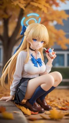 surreal,amazing quality,masterpiece,best quality,awesome,inspiring,cinematic composition,soft shadows,Film grain,shallow depth of field,highly detailed,high budget,cinemascope,epic,color graded cinematic,atmospheric lighting,natural,figure,natural lighting,exqusite visual effect,delicate details,1girl, toki \(blue archive\), blue archive,breasts,halo,solo,school uniform,hair over one eye,smile,large breasts,long hair,choker,blue eyes,skirt,looking at viewer,leaf,shirt,autumn leaves,convenient censoring,cleavage,socks,white shirt,ribbon,black choker,wrist scrunchie,bow,grin,bowtie,hair ribbon,autumn,black skirt,scrunchie,holding,very long hair,blue bow,milk carton,blush,kneehighs,blue ribbon,collared shirt,black socks,sitting,maple leaf,collarbone,one eye covered,blonde hair,thighs,blue halo,falling leaves,blue bowtie,juice box,outdoors,light brown hair,asymmetrical bangs,holding drink,squatting,tree,pleated skirt,