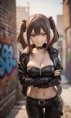 surreal,amazing quality,masterpiece,best quality,awesome,inspiring,cinematic composition,soft shadows,Film grain,shallow depth of field,highly detailed,high budget,cinemascope,epic,OverallDetail,color graded cinematic,atmospheric lighting,imperfections,natural,shallow dof,1girl,solo,looking at viewer,kurumi_ebisuzawa,twin tails,hair ribbon,leather jacket,leather pants,strapless bra,black jacket,tight pants,black chocker,zipper,fingerless gloves,biker clothes,spikes,unzipped,shoulder spikes,multiple belts,shiny clothes,(graffiti:1.2),brick wall,dutch angle,crossed arms,breast hold,arms under breasts,evil smile,smile,parted lips,v-shaped eyebrows,