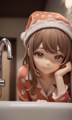 surreal,amazing quality,masterpiece,best quality,awesome,inspiring,cinematic composition,soft shadows,Film grain,shallow depth of field,highly detailed,high budget,cinemascope,epic,OverallDetail,color graded cinematic,atmospheric lighting,imperfections,natural,shallow dof,1girl,solo,looking at viewer,pajamas,sleepy,nightcap,indoors,bathroom,tile wall,sink,bathtub,peeking out upper body,opening door,smile,closed mouth,