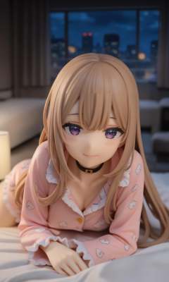masterpiece,best quality,pov_across_bed,looking at viewer,smile,exhausted,hina amano,long hair,hair down,choker,pajamas,lying,on bed,indoors,night,apartment,dark room,skyline,