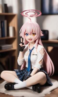 surreal,amazing quality,masterpiece,best quality,awesome,inspiring,cinematic composition,soft shadows,Film grain,shallow depth of field,highly detailed,high budget,cinemascope,epic,color graded cinematic,atmospheric lighting,natural,figure,natural lighting,exqusite visual effect,delicate details,1girl,hoshino \(blue archive\),blue archive,torn clothes,fingerless gloves,skirt,pink hair,solo,shirt,gloves,halo,heterochromia,white shirt,ahoge,long hair,white socks,weapon,blue eyes,yellow eyes,black gloves,socks,necktie,collared shirt,sitting,long sleeves,blue necktie,black skirt,v,plaid skirt,hair between eyes,looking at viewer,pink halo,open mouth,torn shirt,dirty clothes,plaid,pleated skirt,blurry,smile,blurry background,blush,shoes,very long hair,dirty,indoors,black footwear,fang,torn skirt,indian style,school uniform,