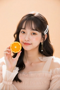 1girl, solo, long hair, looking at viewer, smile, bangs, shirt, black hair, hair ornament, long sleeves, dress, holding, brown eyes, jewelry, closed mouth, white shirt, upper body, earrings, food, lips, fruit, holding food, realistic, holding fruit, orange \(fruit\), lemon