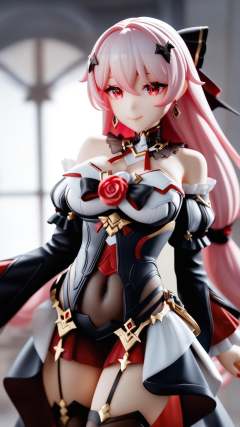 surreal,amazing quality,masterpiece,best quality,awesome,inspiring,cinematic composition,soft shadows,Film grain,shallow depth of field,highly detailed,high budget,cinemascope,epic,color graded cinematic,atmospheric lighting,imperfections,natural,shallow dof,<lora:ye_and_yayi:0.8>,theresa_apocalypse,1girl,solo,red_eyes,long_hair,looking_at_viewer,smile,hair_ornament,bare_shoulders,detached_sleeves,red_rose,closed_mouth,earrings,pink_hair,long_sleeves,covered_navel,hair_between_eyes,black_dress,